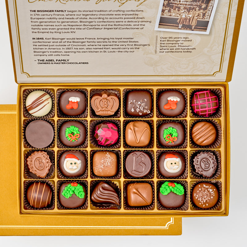 INGREDIENTS: Dark Chocolate (Unsweetened Chocolate Sugar, Cocoa Butter, Milkfat, Soy Lecithin (an emulsifier), Vanilla), Milk Chocolate (Sugar, Whole Milk Powder, Cocoa Butter, Unsweetened Chocolate, Soy Lecithin (an emulsifier),Vanilla), Milk, Heavy Cream (Cream (milk) and Carrageenan), Pecans, Butter, Invert Sugar, Natural Flavor, Vanilla, Raspberries, Salt, Lemon Oil, Raspberry, Citric Acid, Pecans, Cranberries, Pistachio, Hazelnut, Cinnamon, Pear, Sugar Decoration (Sugar, Cornstarch, Dextrose, Dried Egg Whites, Salt, Monocalcium Phosphate, Propylene Glycol Alginate, Artificial Flavors, Artificial Colors (Red 3, Red 40, Blue 1, Blue 2, Yellow 5, Yellow 6), Invertase, Peppermint Oil, Dried Egg White, Color (from Fruit and Vegetable Juice, Invertase.