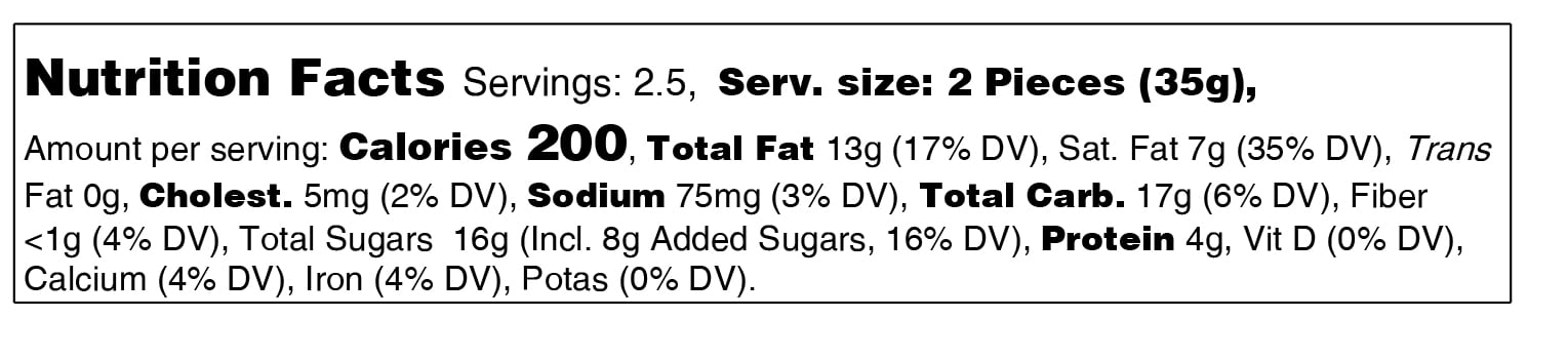 INGREDIENTS: White Chocolate (Sugar, Cocoa Butter, Whole Milk, Non-Fat Milk, Milkfat, Soy Lecithin (an Emulsifier), Natural Vanilla Flavor), Peanuts, Cane Sugar, Palm Fruit Oil, Salt, Sugar, Palm Kernel Oil, Partially Defatted Peanut Flour, Non-Fat Dry Milk Solids, Peanut Oil, Salt, Soy Lecithin (an Emulsifier), Grade A Butter, Fruit & Vegetable Juice (for color)